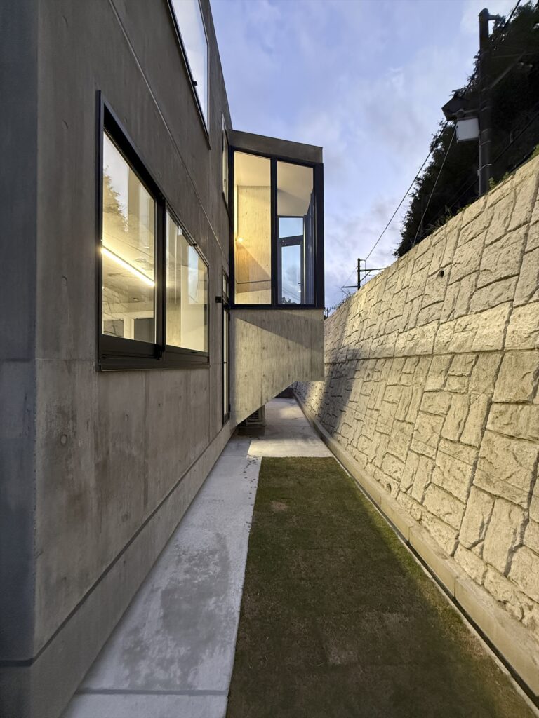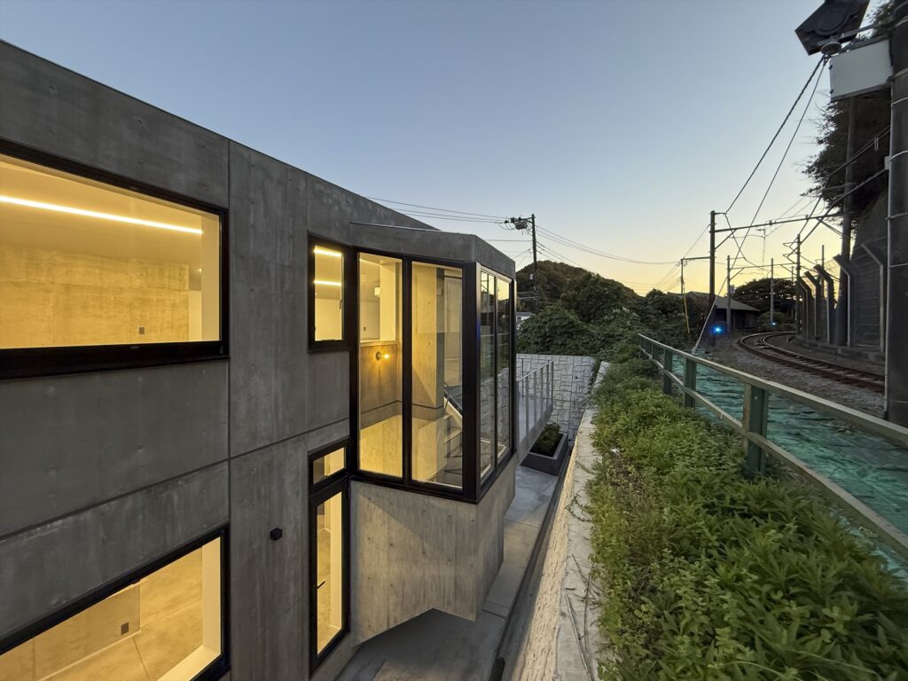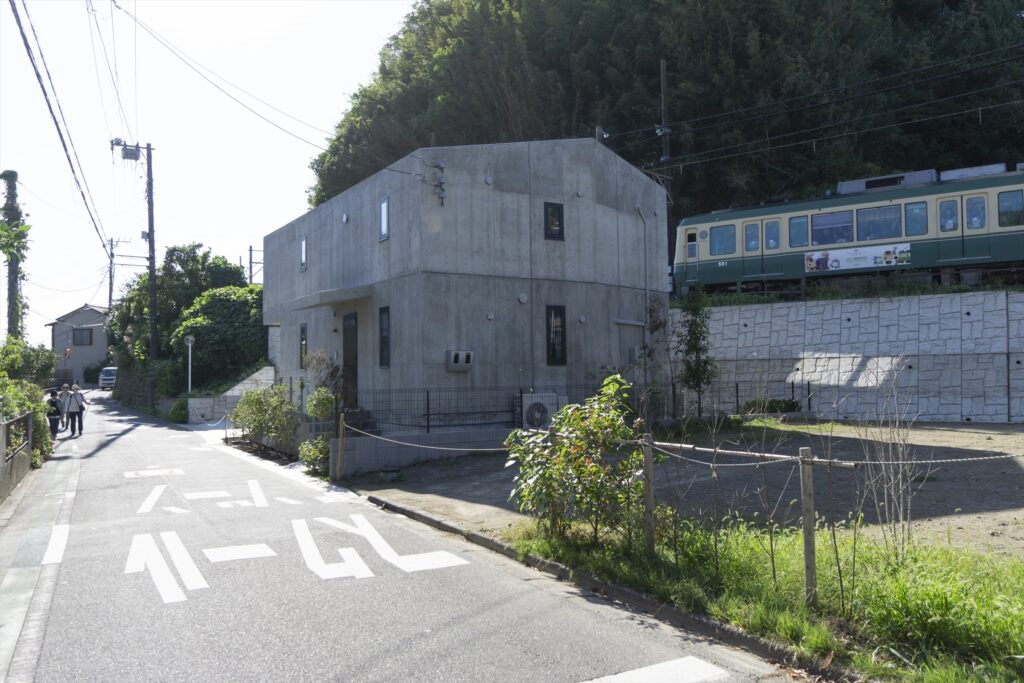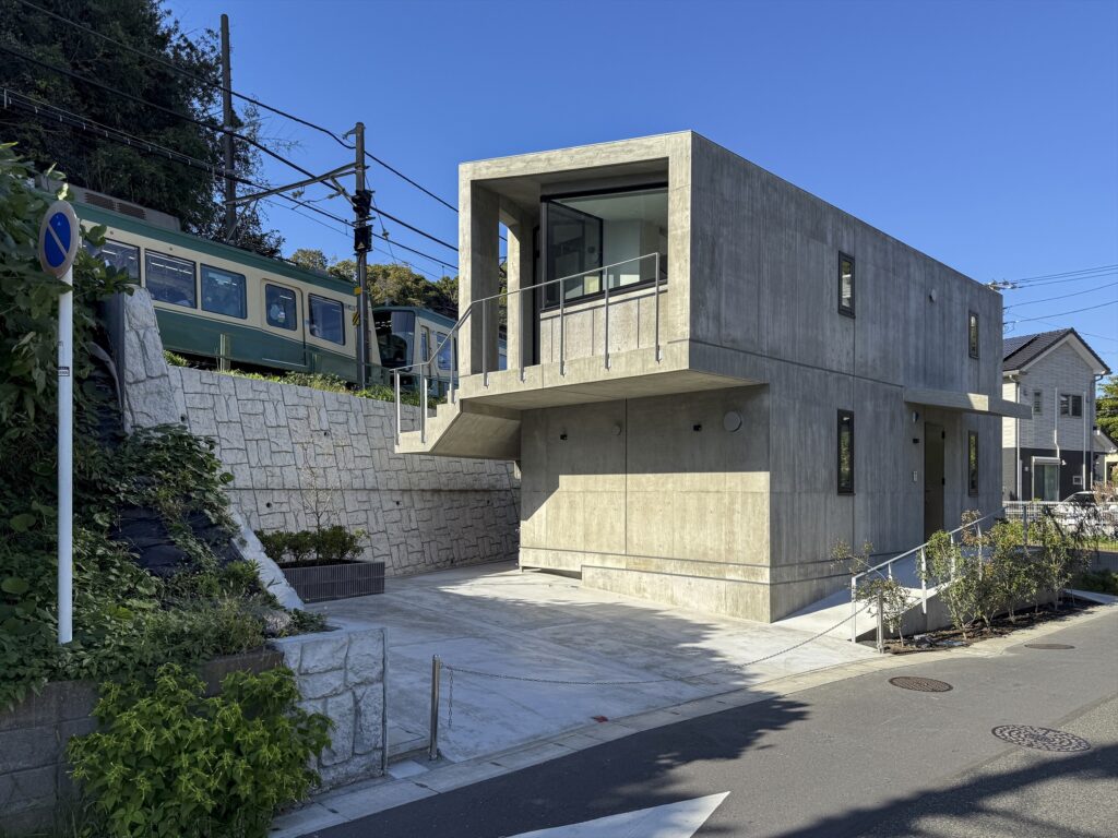鎌倉の谷戸、高さ3mの擁壁を挟んで江ノ電と隣接する夫婦のための住宅。敷地は擁壁の基礎と風致条例によって建築可能範囲が限られている。谷戸越しの自然と山に切り取られた景色と陽の光の享受、趣味の工芸と江ノ電との関係性が主なテーマ。1Fをプライベート、2Fをパブリックと捉えて、外部においては江ノ電に向けて劇場における桟敷席のようなバルコニーを設けた。構造は振動に強く防音性も高い壁式RC造で、基礎施工可能範囲と2台の駐車場を確保するため西側と南側に約2mずつ片持ちしており、約5mの支持層まで杭が伸びる。型枠には少しザラザラとして柔らかな質感が感じられる普通合板を用いたことと、切妻屋根の形状を採用したことで、RC造でありながらも歴史ある鎌倉の町並みに馴染むことを目指した。
