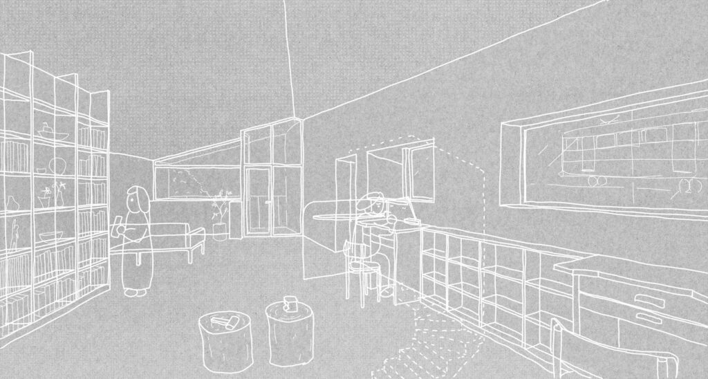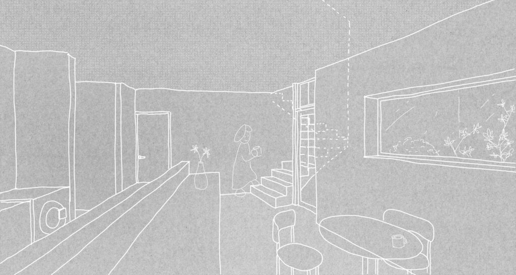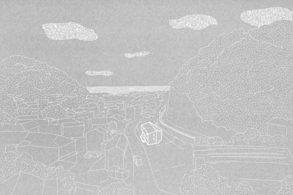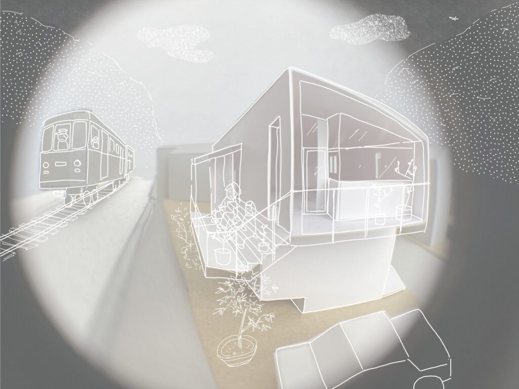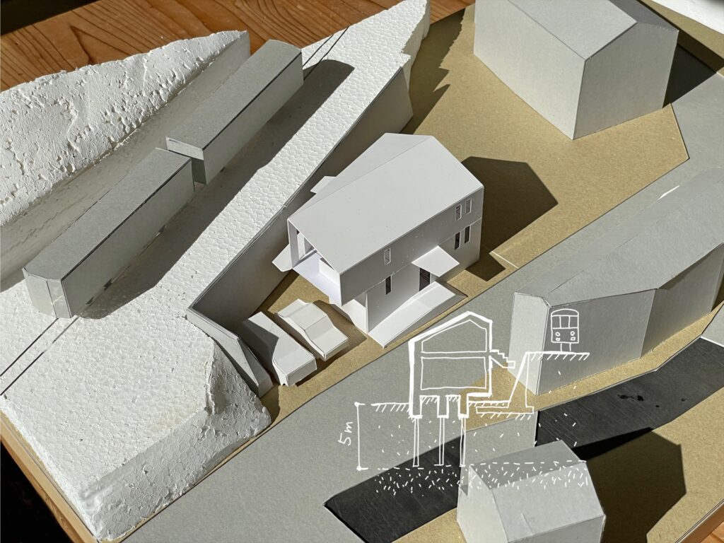 鎌倉の谷戸、高さ3mの擁壁を挟んで江ノ電と隣接する夫婦のための住宅。敷地は擁壁の基礎と風致条例によって建築可能範囲が限られている。谷戸越しの自然と山に切り取られた景色と陽の光の享受、趣味の工芸と江ノ電との関係性が主なテーマ。1Fをプライベート、2Fをパブリックと捉えて、外部においては江ノ電に向けて劇場における桟敷席のようなバルコニーを設けた。構造は振動に強く防音性も高い壁式RC造で、基礎施工可能範囲と2台の駐車場を確保するため西側と南側に約2mずつ片持ちしており、約5mの支持層まで杭が伸びる。型枠には少しザラザラとして柔らかな質感が感じられる普通合板を用いたことと、切妻屋根の形状を採用したことで、RC造でありながらも歴史ある鎌倉の町並みに馴染むことを目指した。