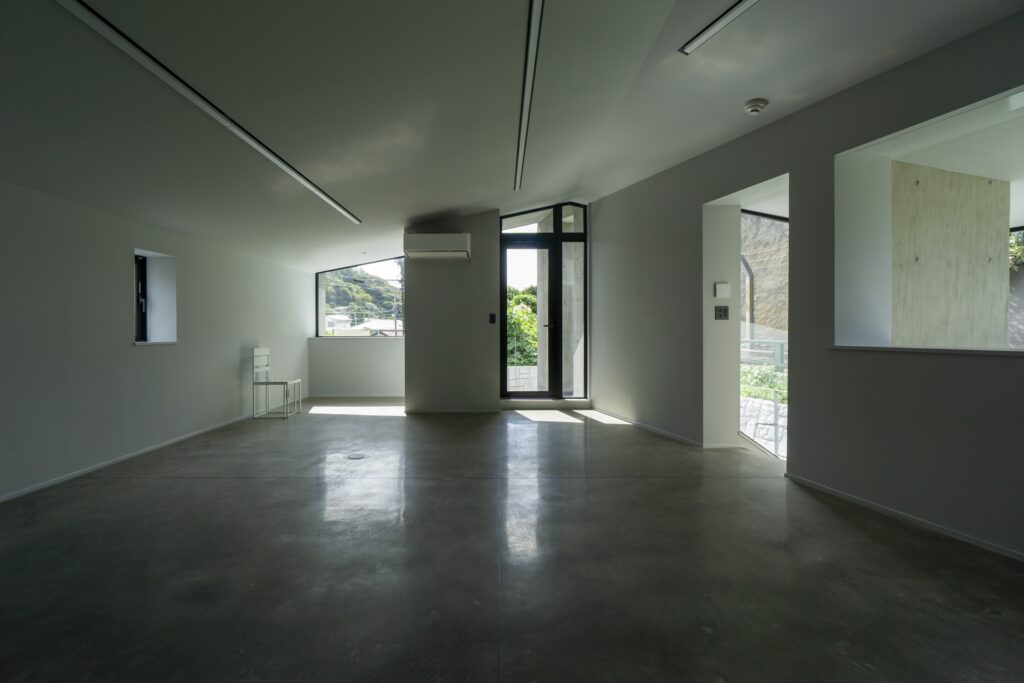 This is a house for a couple, located in a historic yato (valley) in Kamakura, just an hour from Tokyo by train. It sits adjacent to the Enoden railway, separated only by a 3-meter high retaining wall. The building footprint was restricted by both the retaining wall’s foundation and local scenic regulations.